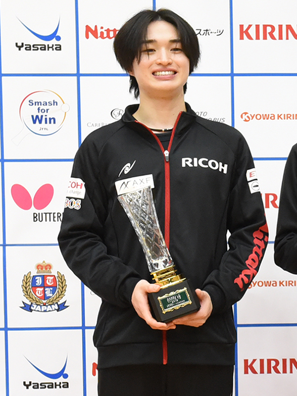 愛知工業大4年時の2024年全日本選手権ではランク決定戦(5回戦)まで進出した実力者。リコー入社2年目の今年は、後期日本リーグで一気にブレーク。愛知工業大の後輩で25年全日本選手権3位の谷垣佑真、25年全日本男子ダブルス優勝の飯村悠太(明治大)などシェークドライブ型の強豪を連破し、愛知工業大時代の22年前期以来となるファインプレー賞を受賞した。