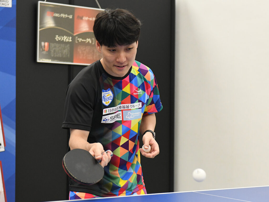 「クセがないけれど上級レベルまで使える、打ち合いでも打ち負けなくなったラバーだなと思いますね。ぼくは以前、バック面に『ラクザ7』を使っていた時もスポンジが硬いものを選ばせてもらっていました。もし当時、『ラクザ7ハード』があったら、間違いなく使っていましたね」(英田)