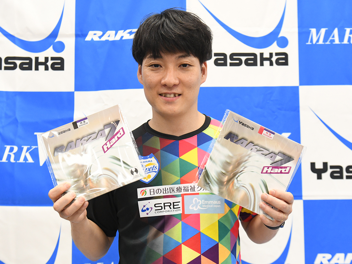 「『ラクザ7ハード』は、『ラクザ7』とは結構違いがありますね。『ラクザ7』の良さを残しつつ、ちょっと物足りないパワーとか、カウンターとか、中陣でのラリーで打ち負けないところが特徴。めっちゃオススメのラバーです」(英田)